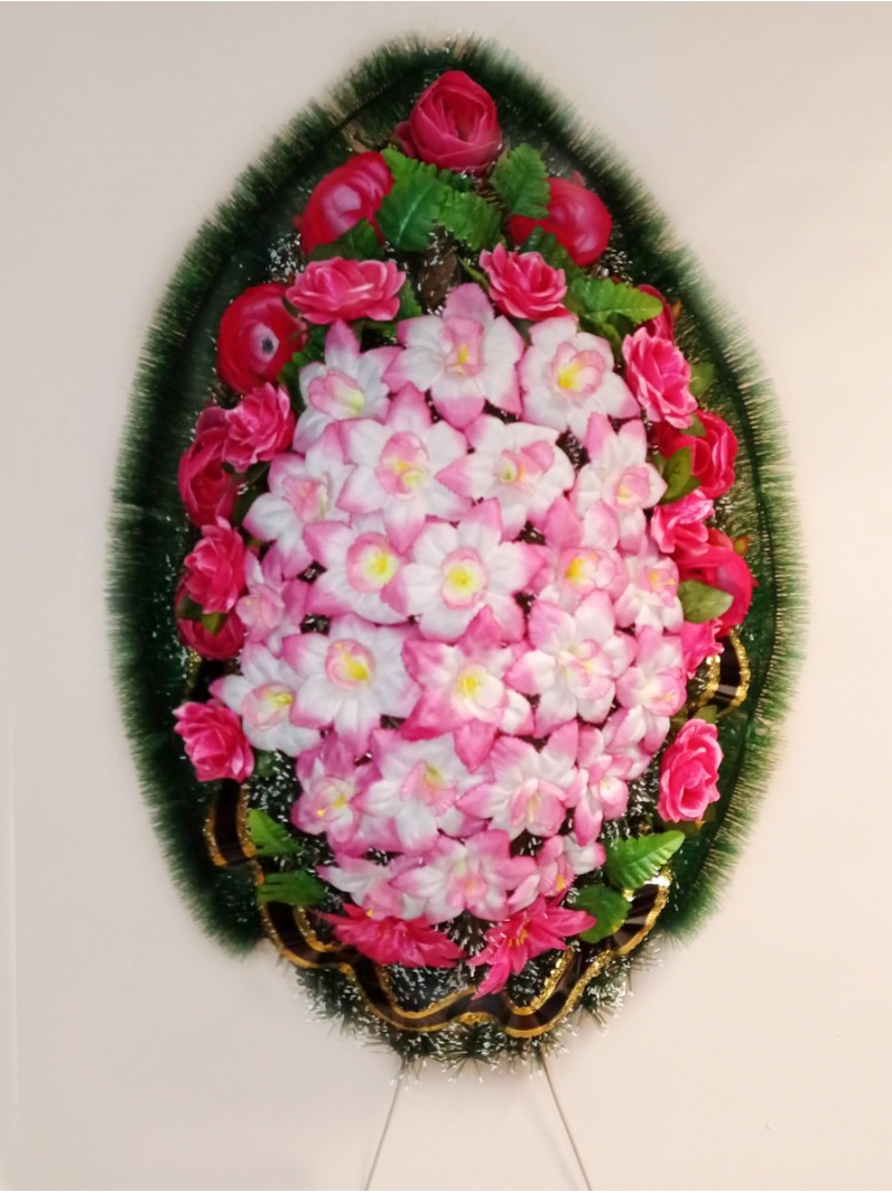Элитный объемный похоронный венок из искусственных цветов, выполненный в овальной форме с лаконичной композицией из розовых и красных бутонов, обрамле..
