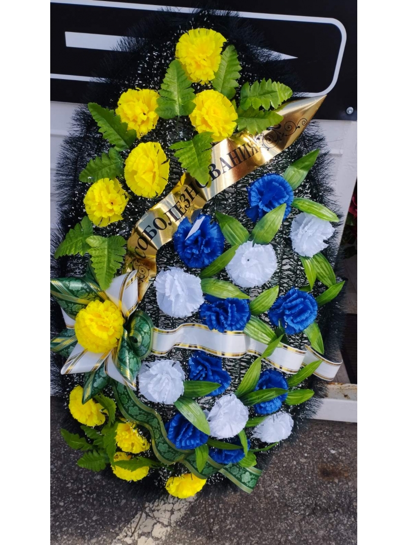 венок похоронный выполнен из цветов и ленты. размер 100/60.